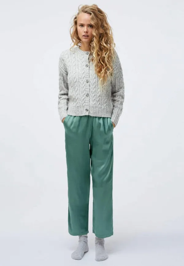 Ажурный кардиган с узором косичкой можно носить и с пижамными брюками, и с кожаными юбками.