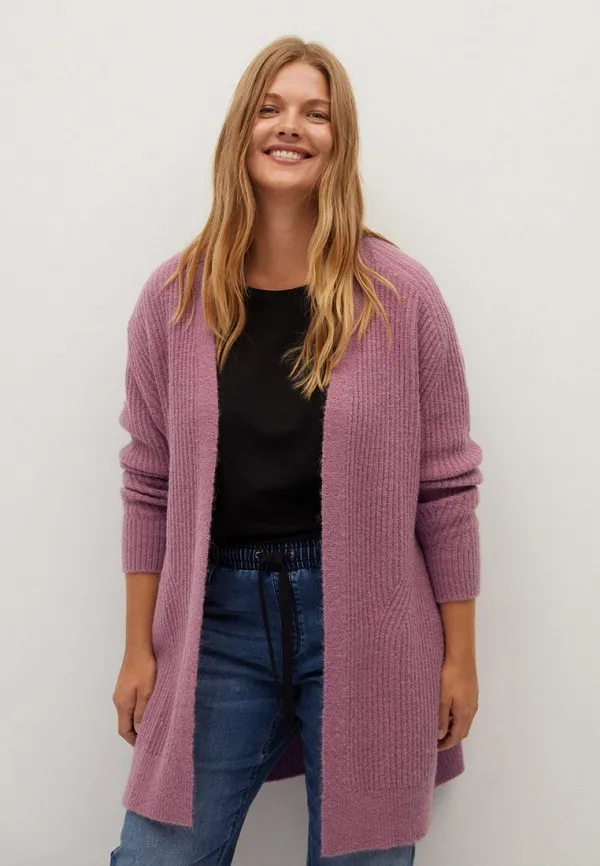 Сиреневый длинный кардиган свободного кроя — это идеальное дополнение к твоей теплой зимней капсуле.
