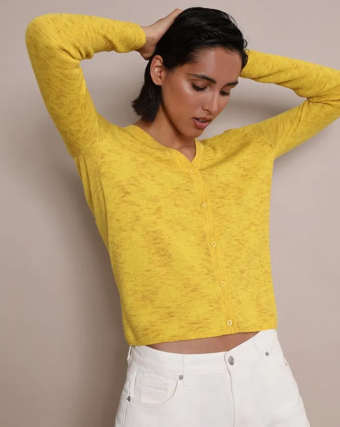 Короткий кардиган в рубчик станет ярким акцентом в твоем кэжуал-образе.