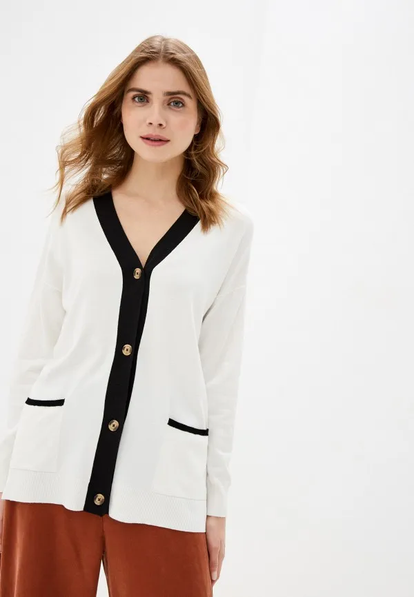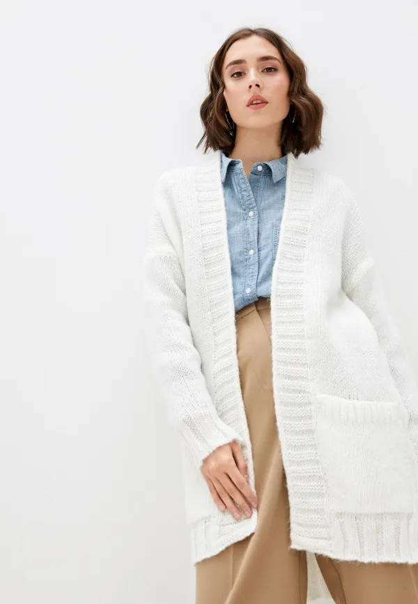 Ажурный белый кардиган на пуговицах внесет разнообразие в повседневный аутфит. Носи его с прямыми брюками или юбками миди-длины.