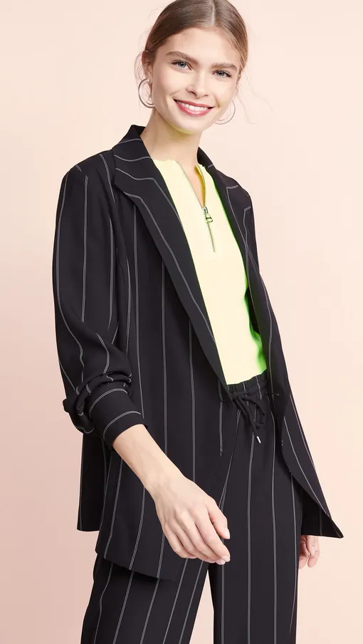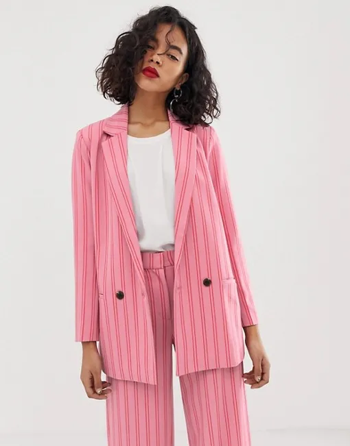 Розовый oversize-пиджак в полоску хорош для свидания. Если вы с любимым планируете прогуляться в парке, надевай классические синие джинсы, кроссовки на толстой подошве, удобную футболку, а сверху пиджак, чтобы не замерзнуть. Отправляясь на ужин в ресторане, добавь к нему широкие брюки, топ в бельевом стиле и лодочки kitten heels.
