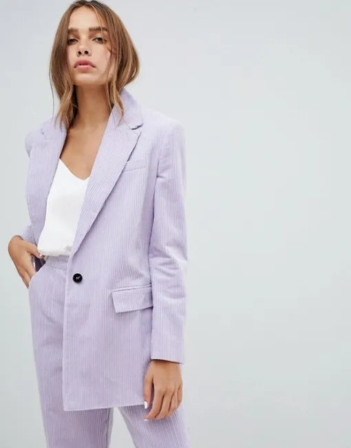 Очень нежный оттенок лаванды, прямой фасон, длина чуть выше колена — этот пиджак определенно заслуживает нашего лайка. Такая модель дополнит романтический образ для свидания и сделает его более женственным и легким.
