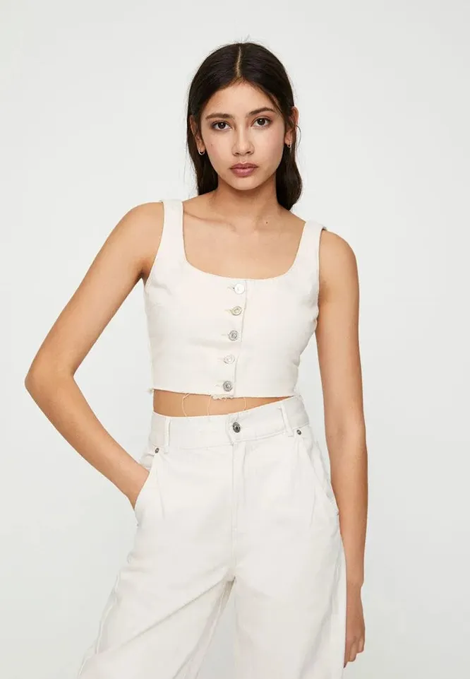 Лаконичный топ на пуговицах носи с широкими брюками с высокой посадкой. Укороченная модель позволит тебе открыть небольшой участок тела и подчеркнуть тем самым тонкую талию. Широкие бретели, округлый вырез, плотный материал и посадка по фигуре — идеальная база для жаркого лета.
