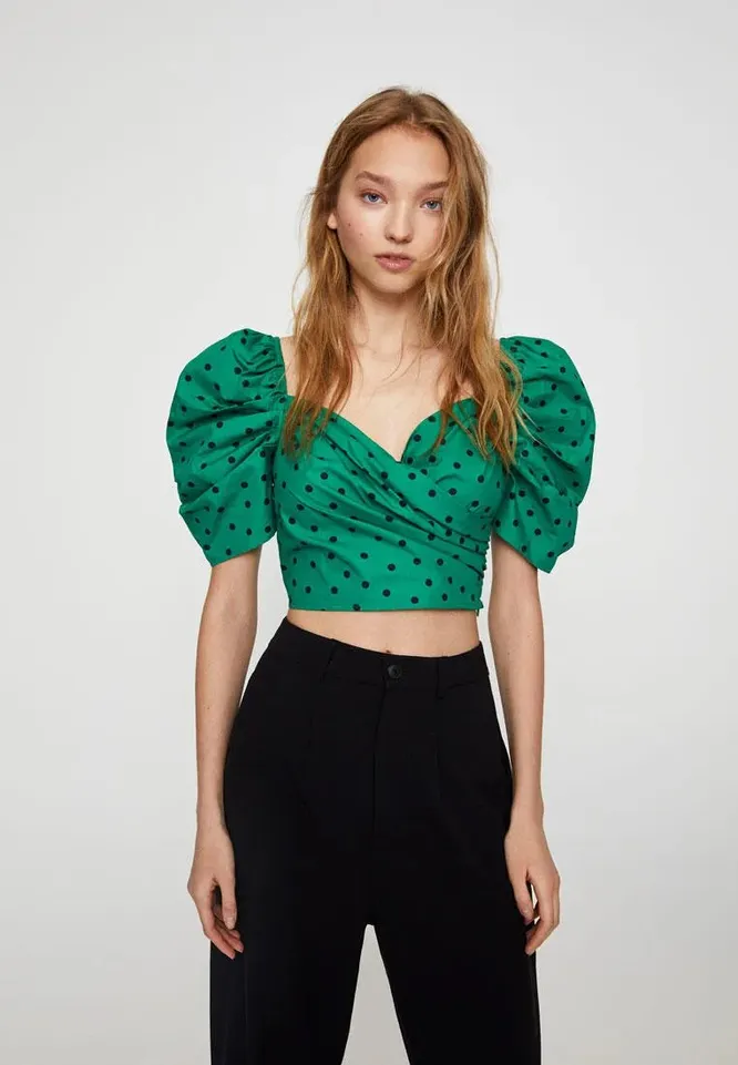 Пышные рукава и горошек — сразу два тренда сочетаются в этой модели. Топ сшит из натурального хлопка, благодаря чему максимально приятно ощущается на коже и позволяет телу дышать в жару. Глубокий зеленый оттенок придает образу благородный вид, глубокий вырез в форме сердца подчеркивает шею и грудь, а укороченная длина акцентирует талию.