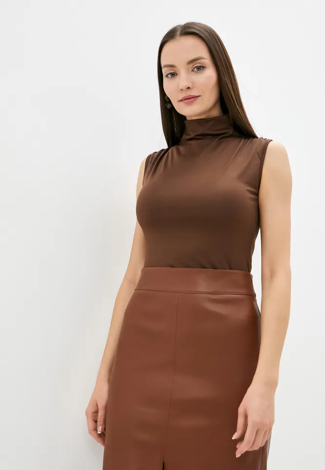 Хорошая альтернатива базовым топам и футболкам – водолазка-боди без рукавов. Для тебя мы подобрали модель красивого коричневого цвета, который легко комбинируется с другими оттенками. Такое боди можно использовать как базу под колючие свитеры, плотные рубашки и пиджаки.