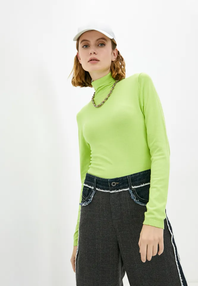Тем, кто не боится экспериментов с цветом, подойдет неоново-зеленая водолазка. Ее легко вписать как в образы с деловым брючным костюмом, так и в аутфиты с брюками карго и куртками в уличном стиле.
