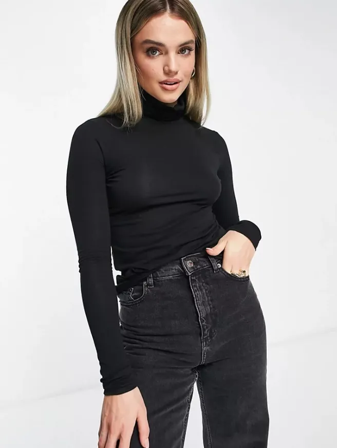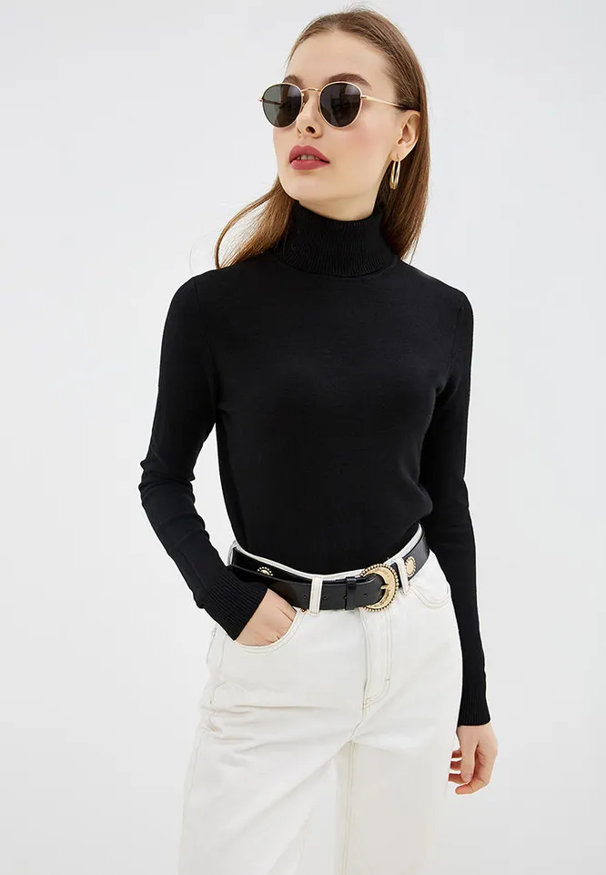 Беспроигрышный вариант на любой случай – черная женская водолазка. Например, в офис ее можно надеть с юбкой по фигуре или классическими брюками и накинуть жакет. Или же использовать как базу под строгий сарафан или платье с вырезом. В рамках вечернего мероприятия черная водолазка отлично смотрится с кожаными брюками-бананами и обувью на каблуке.