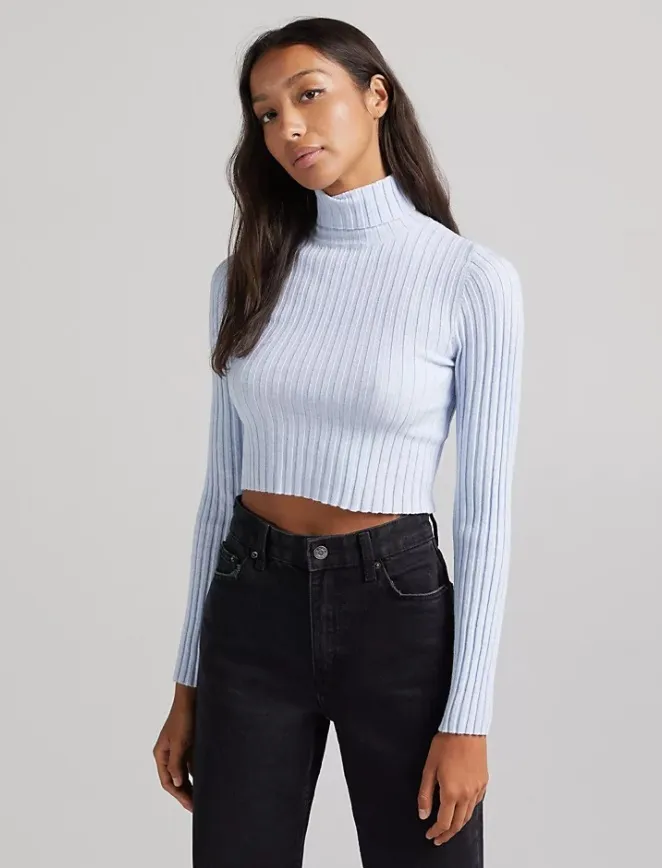 Под джинсы, брюки и юбки с высокой посадкой подойдет короткая женская водолазка. Отдавай предпочтение моделям из плотного трикотажа, чтобы укороченная водолазка не смотрелась вульгарно. Дополняй ее пиджаком мужского кроя или объемным кардиганом.