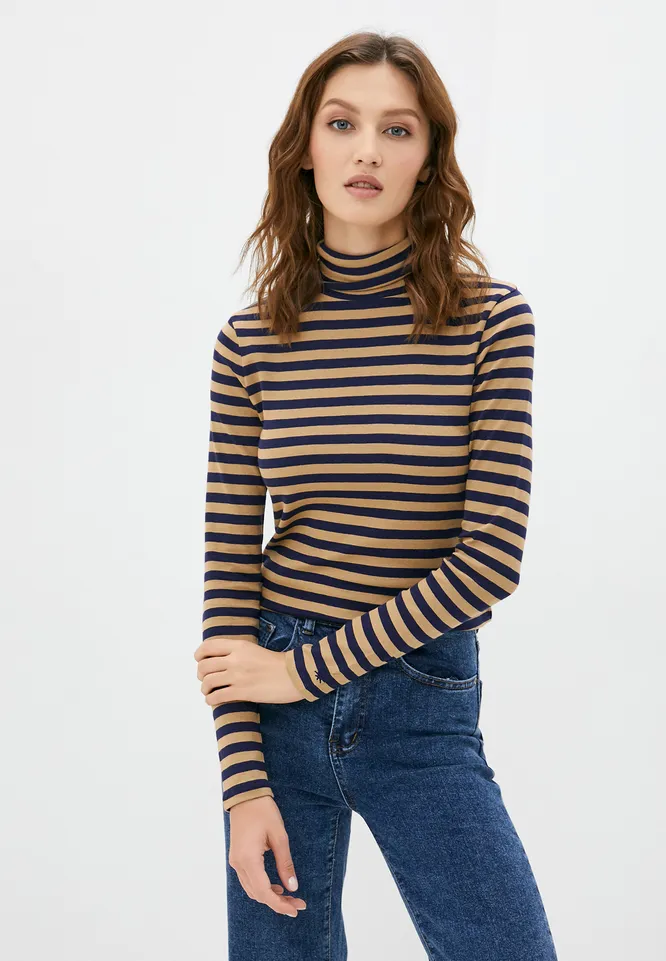 На замену классической тельняшке подойдет водолазка в полоску. Комбинация цветов может быть любой: черно-белая, бело-синяя, черно-коричневая и так далее. Мы остановились модели в коричнево-голубую полоску. Такая водолазка одинаково хорошо смотрится и с синими джинсами, и с брюками всех базовых цветов.