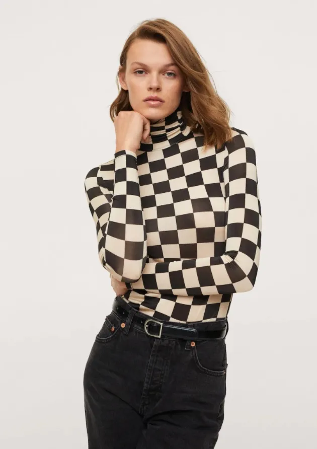 Разнообразить образ с однотонными вещами поможет водолазка с принтом. Наш первый фаворит – модель в черно-белую шашечку. Попробуй миксовать ее с брючным костюмом и кроссовками, летящей юбкой миди и остроносыми ботильонами на каблуке или с повседневными черными джинсами и объемными кардиганом без узоров.
