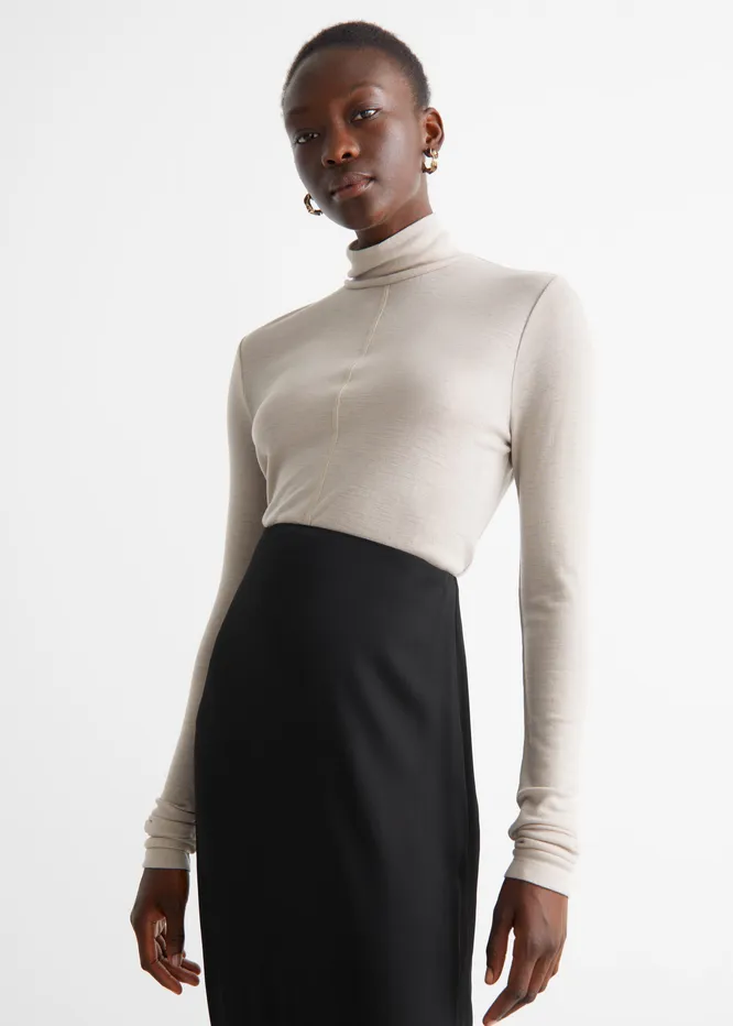 А вот пример элегантного женственного образа с водолазкой и юбкой миди, в котором можно пойти и в театр, и на свидание, и на светское мероприятие.