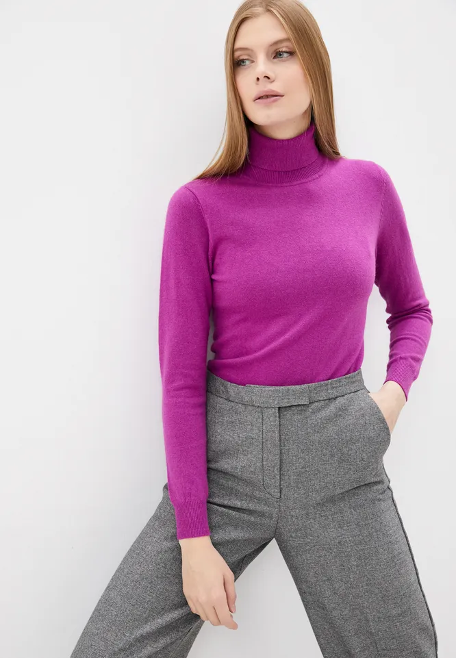 Если хочешь добавить образу яркость, предлагаем купить в интернет-магазине женскую водолазку пурпурного цвета. Особое внимание стоит обратить на нее тем, кто часто носит брючные костюмы: водолазка такого сочного оттенка поможет разбавить классическую двойку и задать образу иное настроение. Также среди актуальных ярких цветов этого сезона можно выделить насыщенный зеленый, оранжевый, горчичный, голубой.