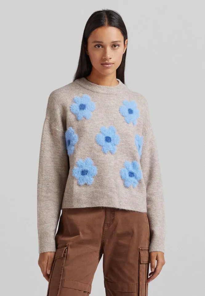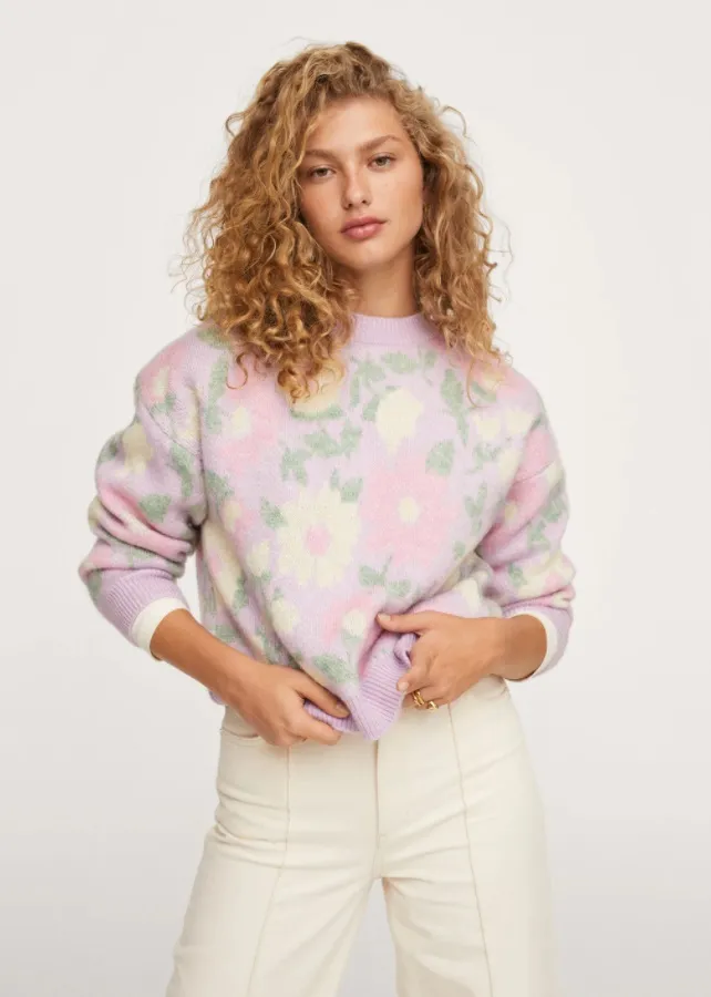 Еще один принт, который всегда в тренде, — цветочный. Он легко интегрируется в разные стили одежды и органично миксуется со множеством других узоров и цветов. Если ищешь что-то яркое и акцентное, советуем купить женский джемпер с крупным цветочным паттерном в виде вышивки. Попробуй носить его с плиссированной юбкой миди и ботильонами на каблуке или базовыми джинсами и грубыми ботинками.