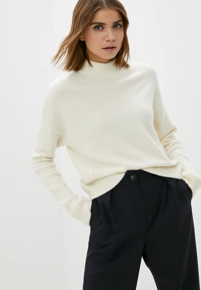 Универсальный вариант на каждый день – белый женский джемпер свободного кроя со спущенной линией плеч. Стильно смотрится и с классическими брюками, и с джинсами, и с плотными юбками. Можно носить его соло, надевать поверх рубашки или использовать как базу под пиджаки мужского кроя.