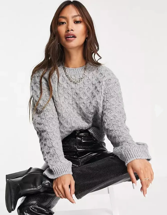Связать спицами женский джемпер с интересным узором далеко не каждой под силу, поэтому бренды предлагают большой выбор моделей фактурной вязки на любой вкус. Бессменный хит зимнего сезона – джемперы с косами. Этот объемный узор придает образу фактурность, делает более сложным и интересным. Этот голубой вязаный джемпер станет удачным дополнением к базовой белой рубашке и джинсам или брюками из плотной ткани.