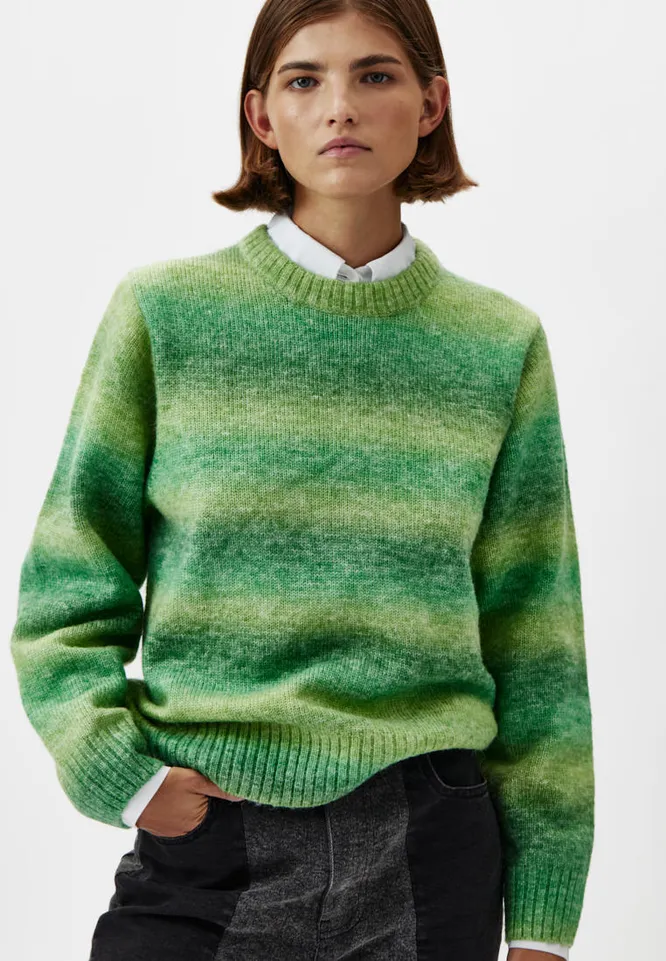 Этот зеленый джемпер органично впишется в разные стили одежды. Он одинаково хорошо смотрится и с джоггерами, и со строгими юбками, и модными кожаными брюками, и с трикотажными штанами. Подчеркнуть его яркий цвет помогут золотистые украшения.