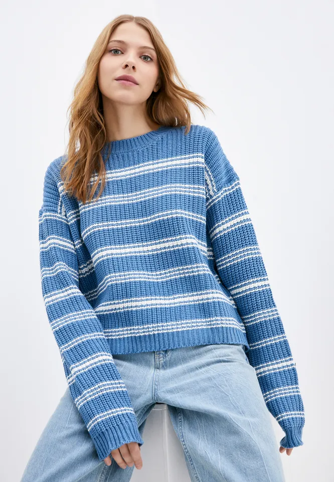 Полоска – нейтральный узор, который хорошо рифмуется с другими принтами и органично вписывается в образы. На зиму-2022 предлагаем купить женский голубой джемпер в тонкую белую полоску. Стильно смотрится со светлыми джинсами и высокими белыми ботинками на тракторной подошве.