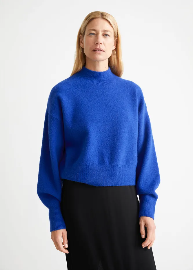 Хорошо согреет и преобразит гардероб яркий синий джемпер из шерсти. Носим его с теплыми джоггерами, зимними кроссовками и пальто из овчины для создания комфортного аутфита или комбинируем с широкими брюками со стрелками и ботильонами на каблуке, если хочется собрать более элегантный наряд.