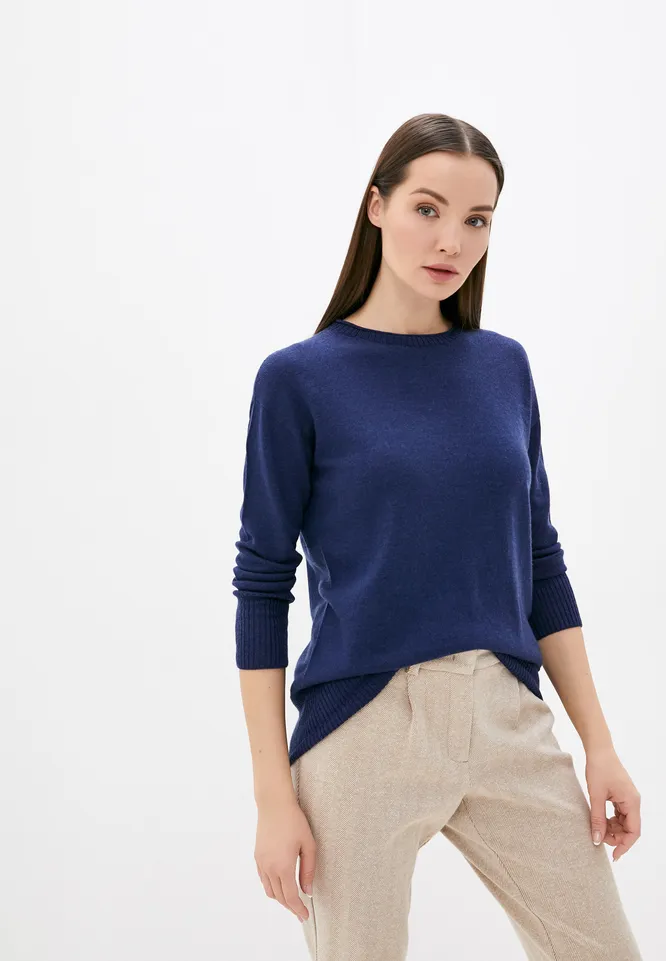 Еще одна базовая модель – тонкий женский джемпер темно-синего цвета. Модель выполнена из 100% натуральной шерсти – то что нужно в холода. Он легко впишется как в повседневные, так и в деловые луки. В первом случае советуем носить его с кожаными брюками и пиджаком, во втором – с «бананами» и строгим жакетом.