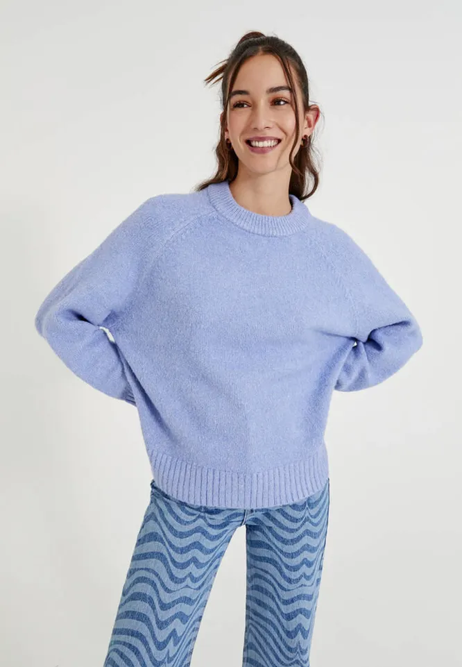 Свободный голубой джемпер с рукавами реглан хорошо рифмуется с широкими трикотажными брюками, джоггерами, длинными прямыми юбками и джинсами. Чтобы подчеркнуть талию, выбирай низ с высокой посадкой и заправляй переднюю часть джемпера за пояс. Можно поиграть с цветами и дополнить джемпер вельветовой юбкой зеленого цвета или насыщенно-бордовыми брюками.