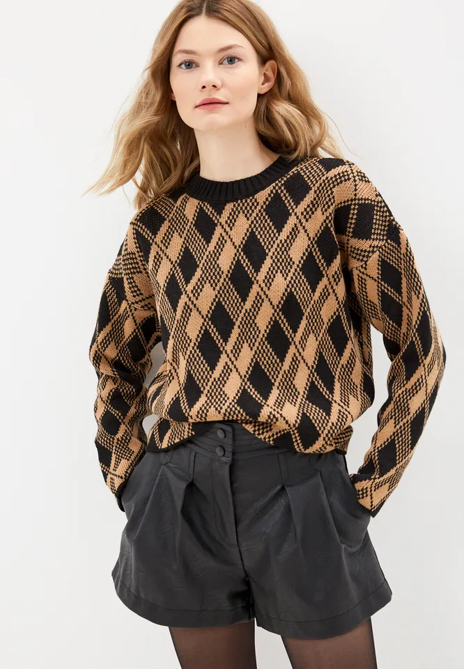 В этом сезоне как никогда актуальны узорчатые свитер и джемперы. Наш первый фаворит – женский джемпер в ромбик. Модель стильно смотрится с белой рубашкой, кожаными брюками и твидовой сумкой на цепочке – удачный образ для вечеринки или ресторана. Также можно надеть его со строгими брюками или юбкой и отправиться в офис.