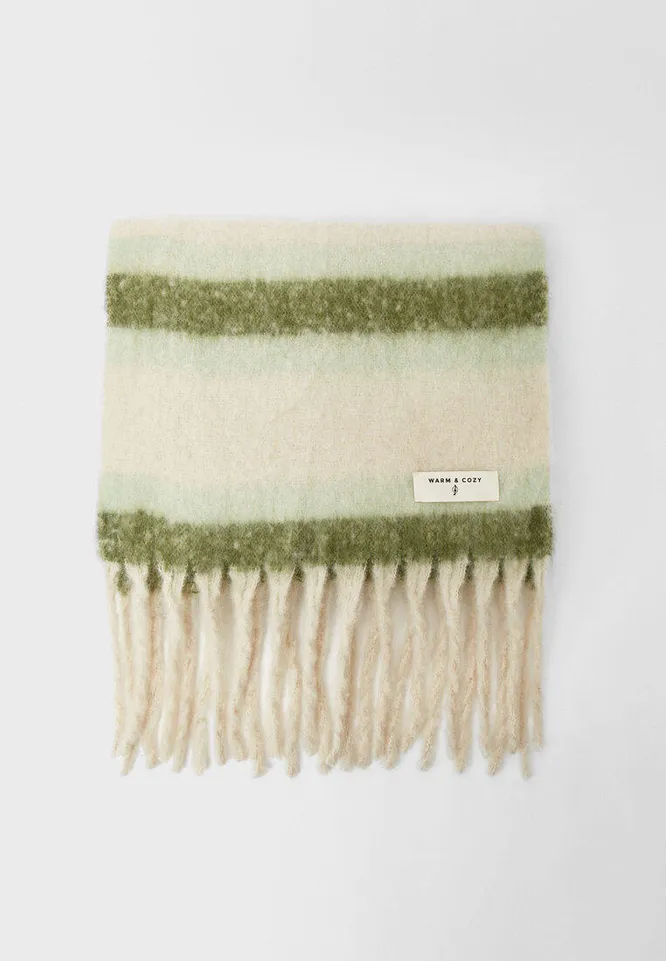 Еще один вечно актуальный принт – полоска. Наш первый фаворит – уютный теплый шарф в горизонтальную бежево-зеленую полоску. Модель круто смотрится с бежевыми пальто, куртками разных цветов, укороченными дубленками. В пару к нему советуем подобрать однотонную шапку цвета, представленного на шарфе, – получишь гармоничный дуэт аксессуаров на каждый день.