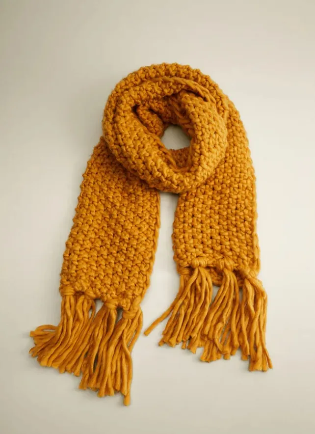 Добавить красок в осенне-зимний образ поможет яркий шарф горчичного цвета. Крупная вязка и бахрома сделают образ более фактурным и динамичным. Чтобы аутфит смотрелся гармонично, подбери к шарфу объемную шапку с отворотом. Идеально подойдет коричневая или бордовая бини. Что касается верхней одежды, то этот шарф подойдет к оверсайз-пуховикам и меховым пальто.