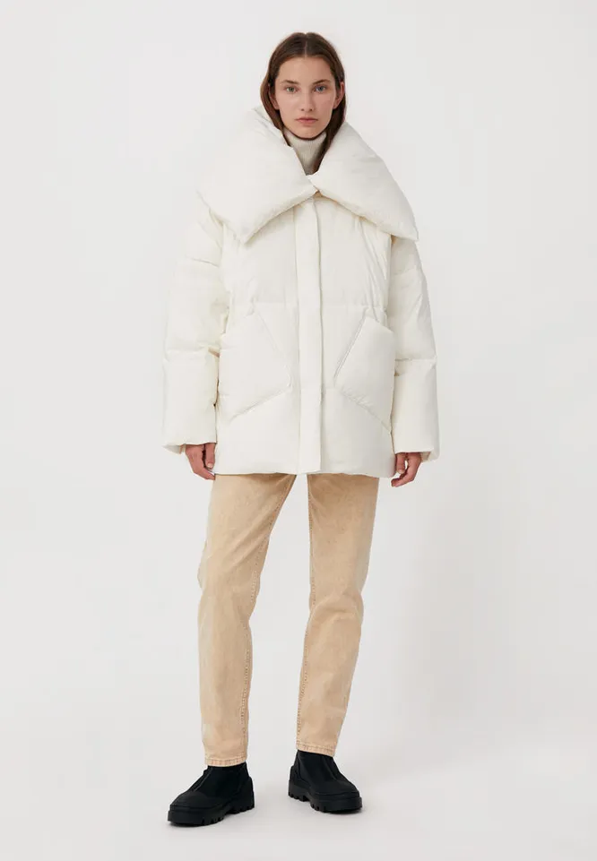 Поклонницам расслабленных силуэтов подойдет белый пуховик оверсайз. Первый вариант, который мы подобрали для тебя, — укороченная модель свободного кроя с объемным воротником. Чтобы сбалансировать объемный верх, сочетай куртку с прямыми или узкими брюками и джинсами, а также платьями и юбками полуприлегающего кроя.
