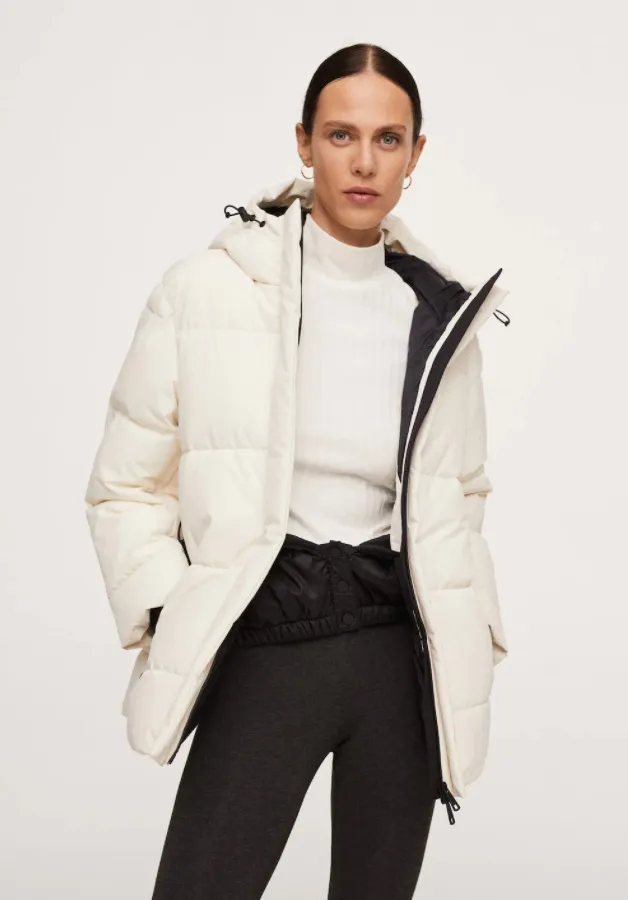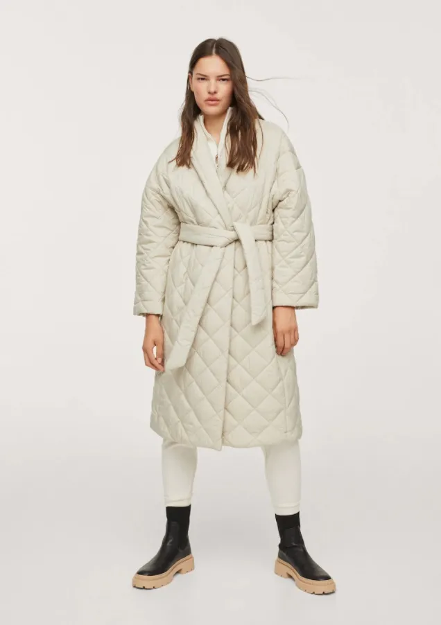 Если ты ищешь что-то элегантное и нейтральное, выбирай белый пуховик-пальто с ромбовидной стежкой с поясом. Такой фасон хорошо сидит на любой фигуре и легко вписывается в разные стили одежды: от спортивного до делового. Какая шапка подойдет к этому белому пуховику? Обычная вязаная бини, капор или модная в этом сезоне дутая косынка.