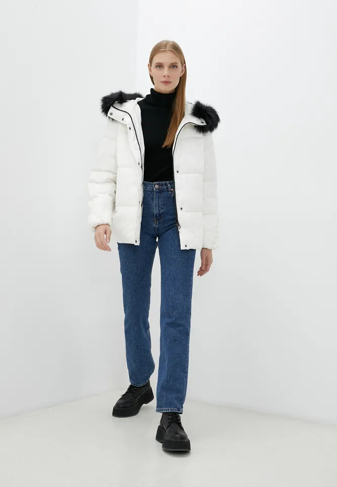 Тем, кто предпочитает базовые и практичные вещи, советуем купить этот белый женский зимний пуховик с мехом. Он выполнен из стеганого водоотталкивающего текстиля и имеет искусственный наполнитель. Хорошо смотрится с любыми фасонам джинсов, брюк, а также органично сочетается с платьями и юбками миди. Что касается обуви, то мы рекомендуем носить этот пуховик с акцентными ботинками или ботильонами на блочном каблуке.