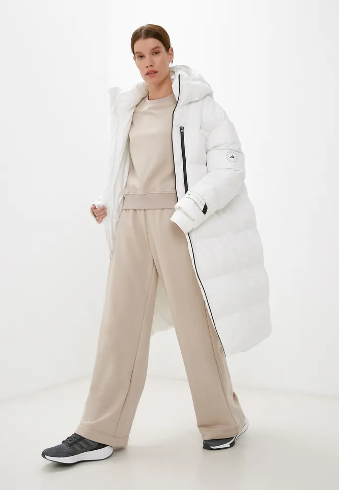 За основу берем уютный трикотажный костюм с оверсайз-худи и джоггерами и городские кроссовки. Поверх надевай длинный белый пуховик свободного кроя и добавь пару аксессуаров (например, кожаную панаму и сумку на плечо).
