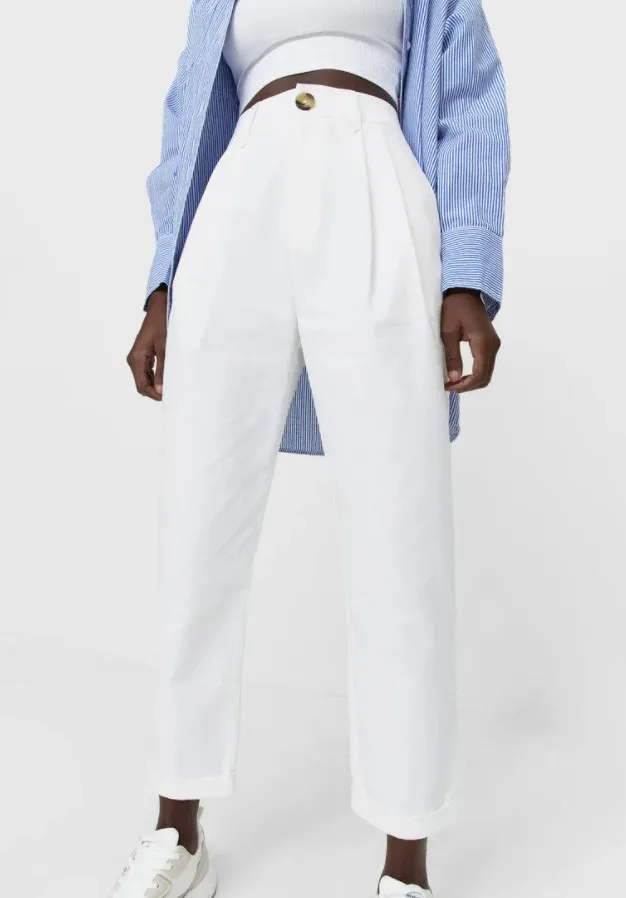 Интересная модель на каждый день — бежевые брюки в тонкую полоску с разрезами. Они классно смотрятся в сочетании с массивными кроссовками, укороченными топами и кардиганами. Если хочешь получить лук в стиле smart casual — сочетай их с рубашкой прямого кроя и удлиненным пиджаком оверсайз.
