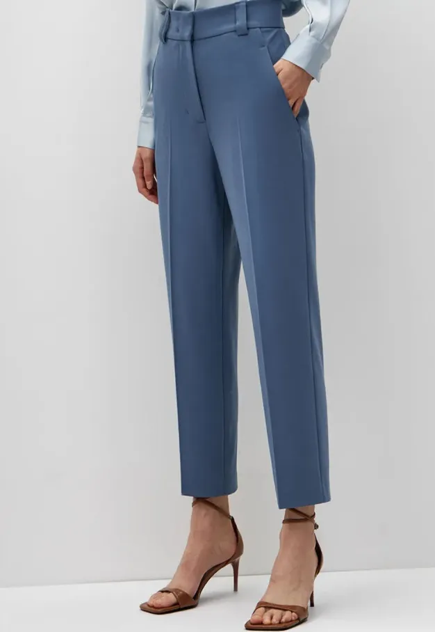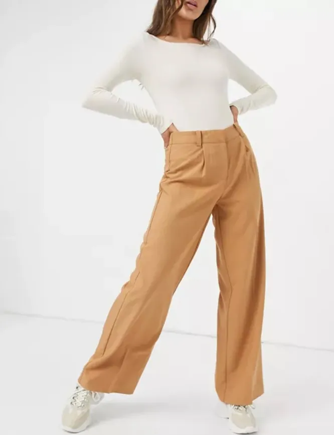 Если нужно добавить бедрам объем, выбирай брюки с высокой посадкой и защипами. Можно носить их с облегающими топами и водолазками или сочетать с фактурными блузами, декорированными рюшами и воланами.