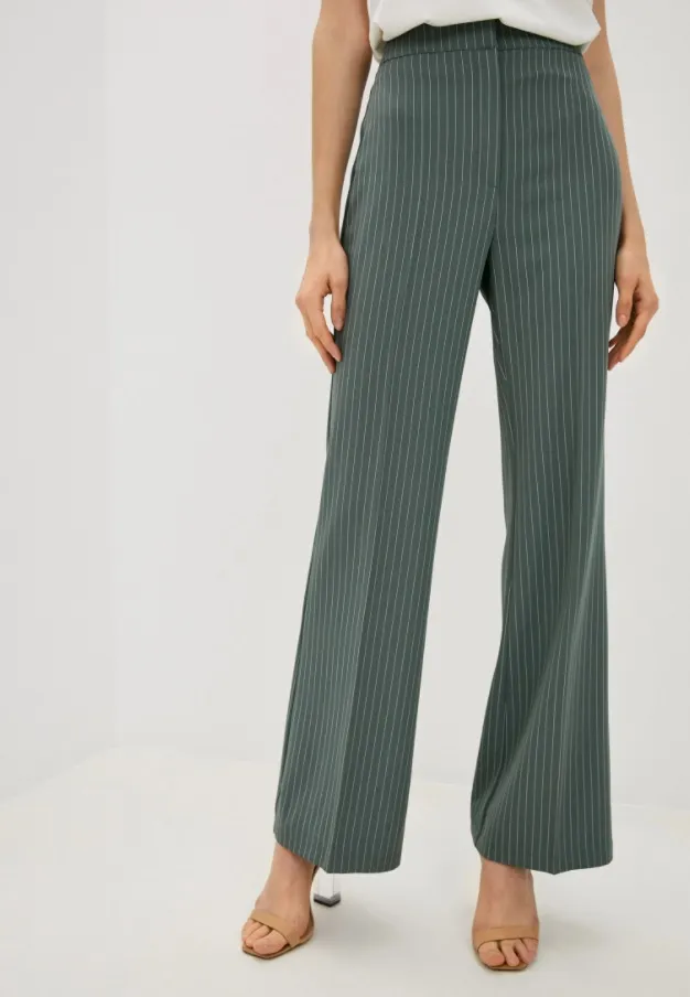 Актуальны и широкие брюки, расклешенные книзу. Мы выбрали модель темно-зеленого цвета в тонкую вертикальную полоску.