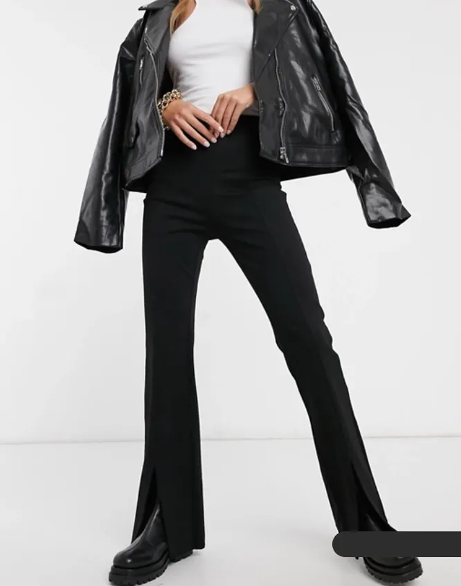 В этих брюках соединилось сразу два тренда — клеш и разрезы, поэтому они органично впишутся и в элегантные образы с женственной блузой, и в повседневные комплекты с яркими свитшотами и куртками в спортивном стиле.
