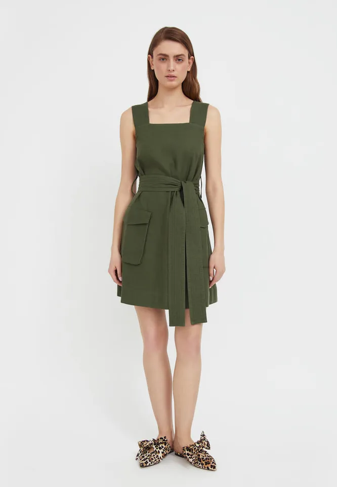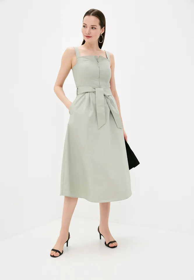 Если дресс-код позволяет, выбирай сарафан мини цвета хаки. Поверх можно накинуть легкий жакет или однотонное кимоно.