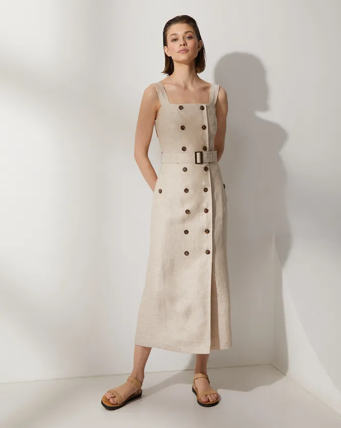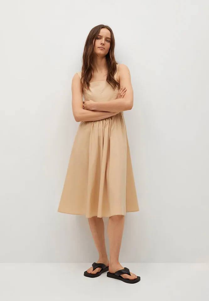 Идеальный вариант в жаркую погоду — бежевый сарафан из 100% льна. Дополни его мюли на каблуке-рюмочке и небольшой сумкой через плечо.