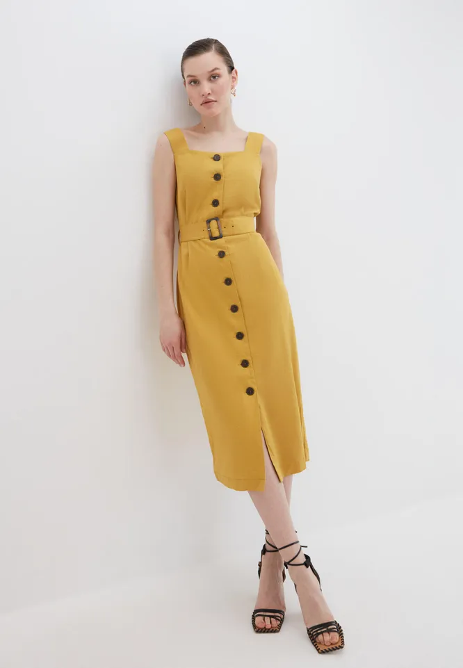 Горчичный сарафан органично сочетается с эспадрильями, остроносыми туфлями с открытой пяткой, босоножками. Завершить образ можно с помощью пары минималистичных украшений и лаконичной сумки.