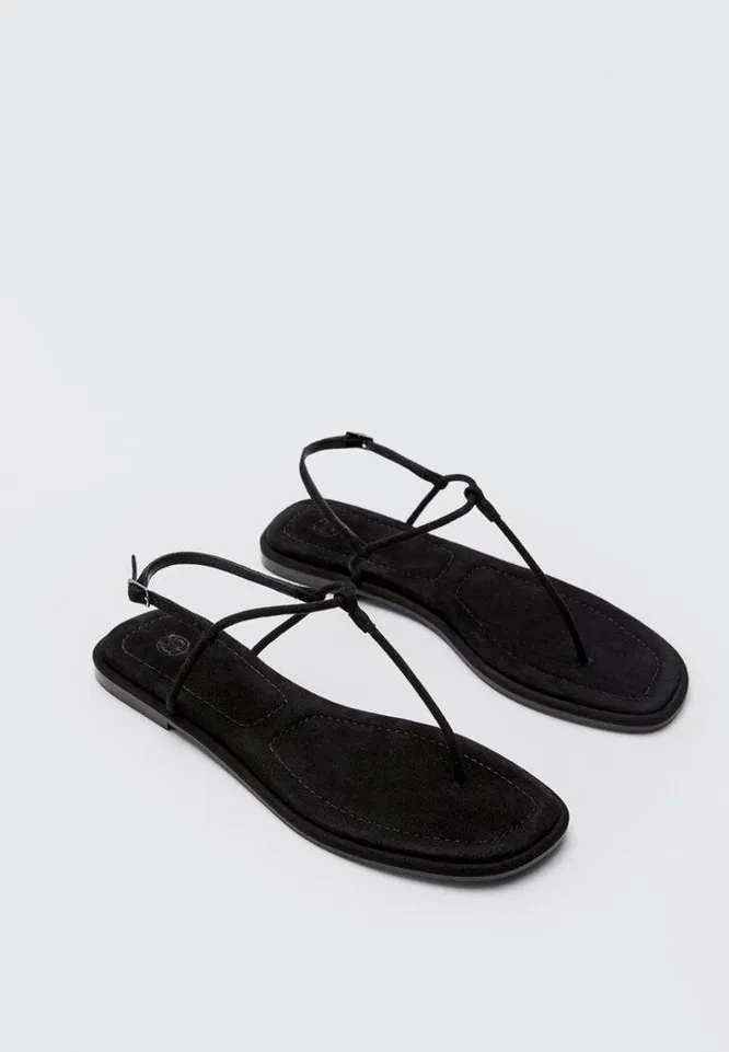 Сандалии с очень тонкими перемычками — то, что нужно для жаркой погоды. Они будут практически незаметны в образе (несмотря на черный цвет), за счет чего ноги визуально будут выглядеть длиннее.