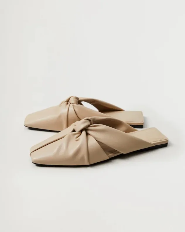 Бежевые мюли на высоком каблуке помогут вытянуть силуэт. Носи их с платьями миди или макси, а также с брюками палаццо.