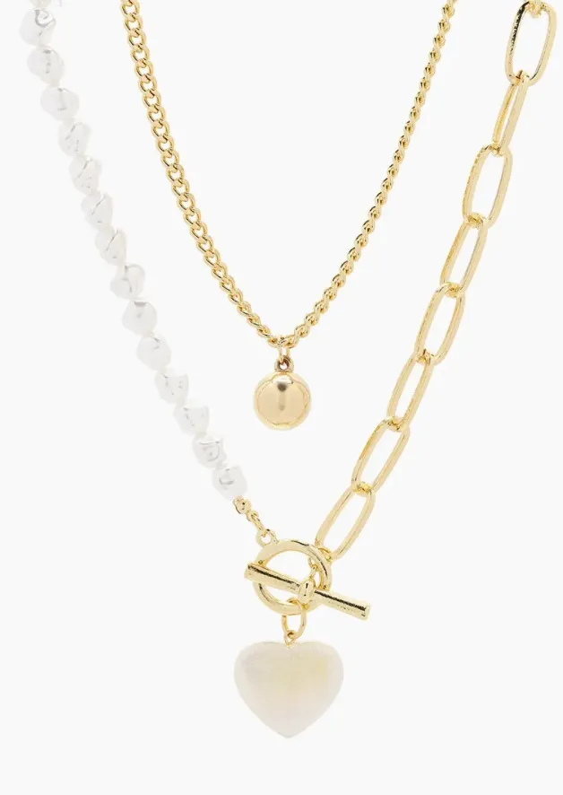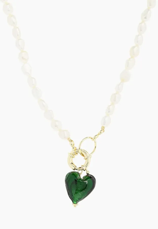 Красивое сочетание перламутрового жемчуга и зеленого камня в форме сердца делает это колье идеальным дополнением как к женственным платьям, так и к повседневным рубашкам и футболкам.