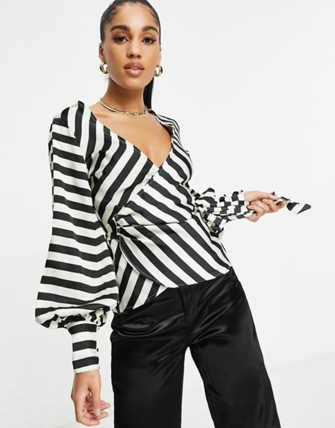Если живот и бока — твои проблемные зоны, обрати внимание на топ в черно-белую полоску. Вертикали принта имеют разные направления, за счет чего визуально сужается талия и удлиняется шея.