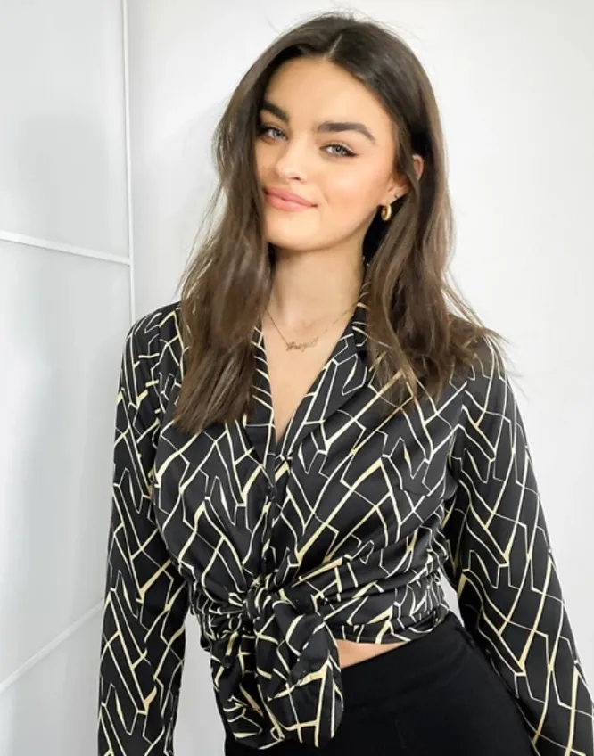 Отличная альтернатива классической рубашки – атласная блузка с минималистичным геометрическим принтом и V-образным вырезом. Чтобы шея и ключицы казались еще более изящными, дополни ее аккуратным кулоном на тонкой цепочке.