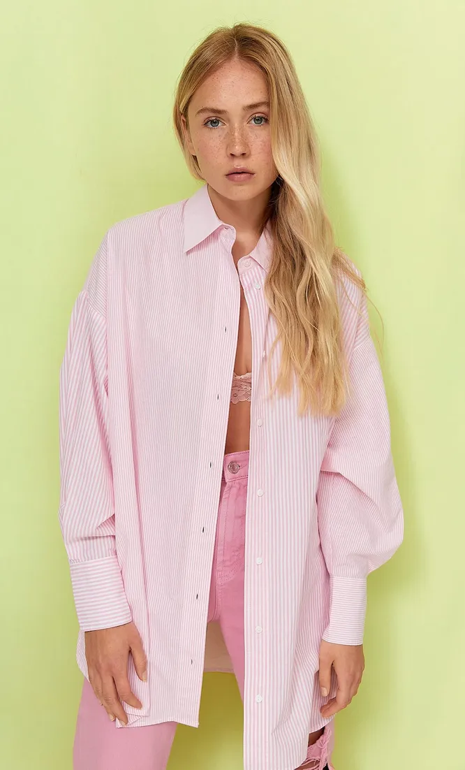 Оверсайз-крой и тонкая вертикальная полоска — в этой рубашке ты будешь казаться просто Дюймовочкой (в хорошем смысле).