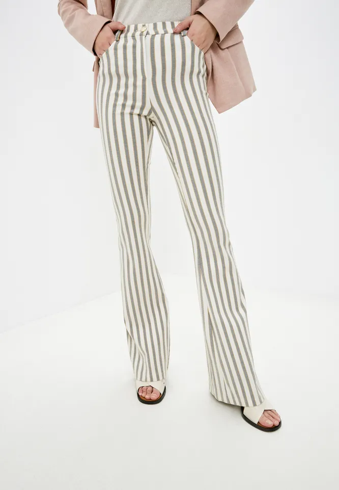 Расклешенные брюки в полоску визуально удлинят ноги и вытянут силуэт. Дополнить их можно однотонным верхом и обувью на каблуке.