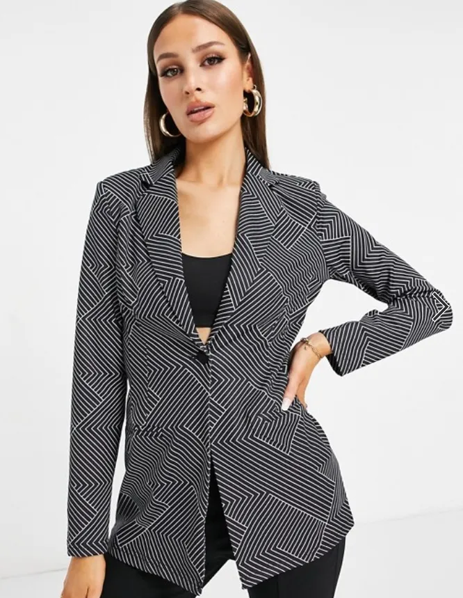 Блейзер со сплошным геометрическим узором советуем носить либо с однотонными брюками и юбками, либо с моделями в вертикальную, более крупную полоску.