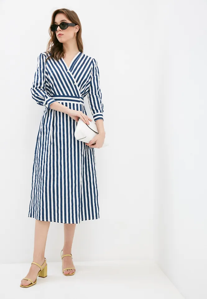 Платье с запахом и вертикальной полоской поможет «нарисовать» талию, зрительно удлинит шею и ноги.