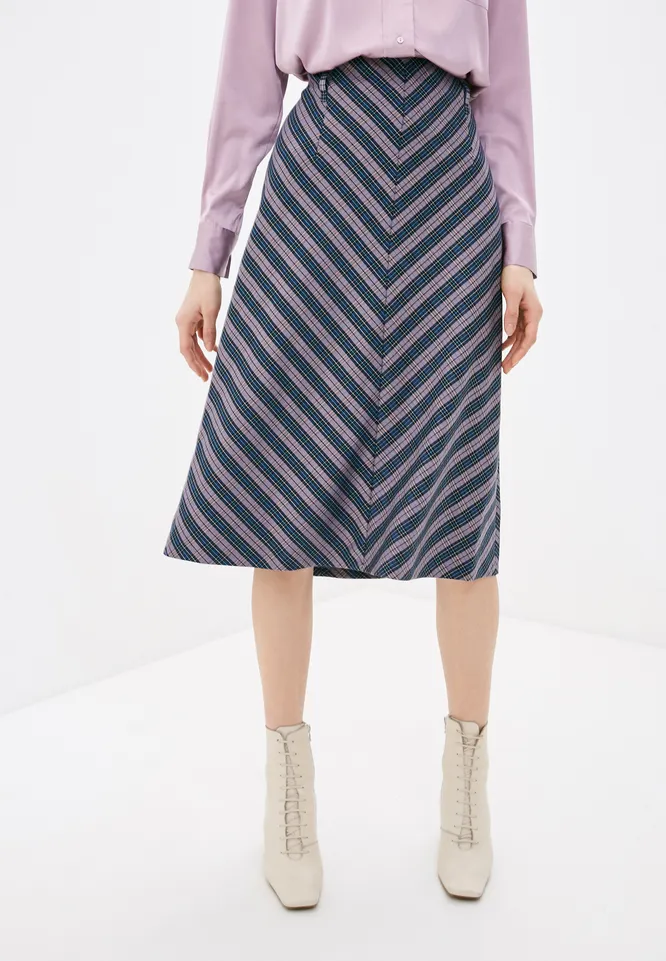 Юбка А-силуэта в «елочку» идеально впишется как в деловые, так и в повседневные образы. В первом случае советуем носить ее со строгой рубашкой и однотонным жакетом, во втором — с оверсайз-свитером или элегантной блузкой.