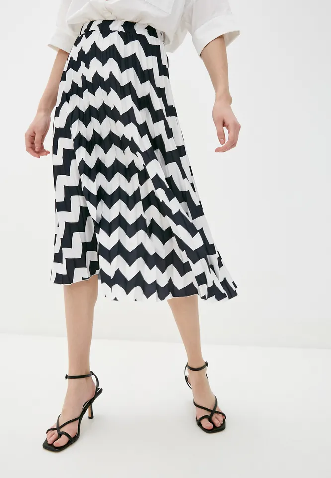 Еще одна интересная модель — юбка с зигзагообразным узором. Они идеально впишется в образ с романтичной шелковой блузой, лаконичным удлиненным свитером, структурированной базовой рубашкой.