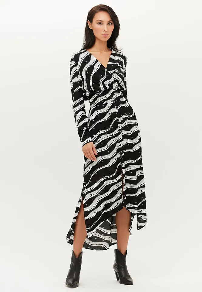 Косые линии принта и крой платья стройнят любую фигуру. Советуем носить его с остроносой обувью и изящными аксессуарами.